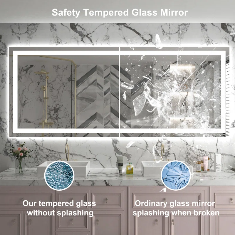- Safe and high-quality material: tempered glass, shatter-proof – different from other mirrors, our LED bathroom mirror is designed with 5 mm tempered glass, which is hard to be broken even if it’s broken, it will break into small and harmless pieces and will not fall out provides clear reflection, features shatter-proof, explosion-proof, sturdy, durable and safe to use